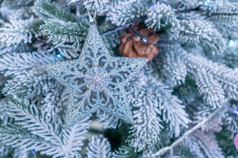 Рождественское украшение с орнаментами и цветами, крупным планом. Новогодняя елка с игрушками и гирляндами на ветвях рождественской елки
