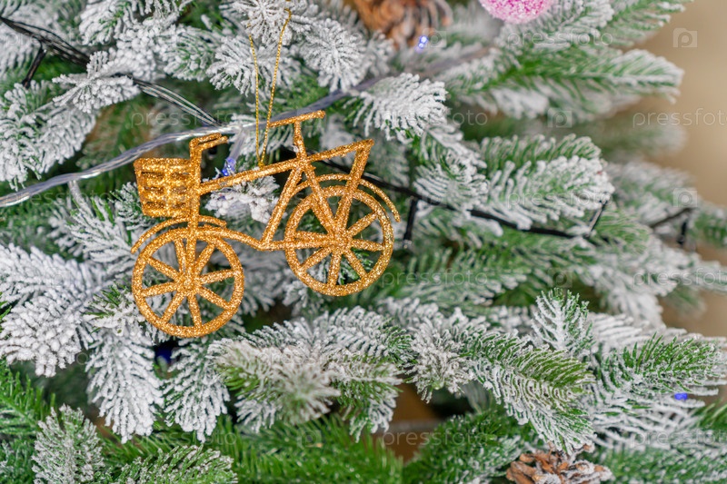 Рождественское украшение с орнаментами и цветами, крупным планом. Новогодняя елка с игрушками и гирляндами на ветвях рождественской елки