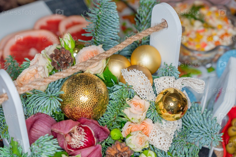 Новогоднее украшение с орнаментом и цветами, крупным планом. Елка с игрушками и гирляндами на ветках елки