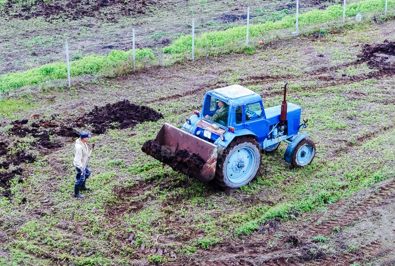 Сельскохозяйственные работы на полях. Синий трактор вспахивает землю. Удобрение почвы