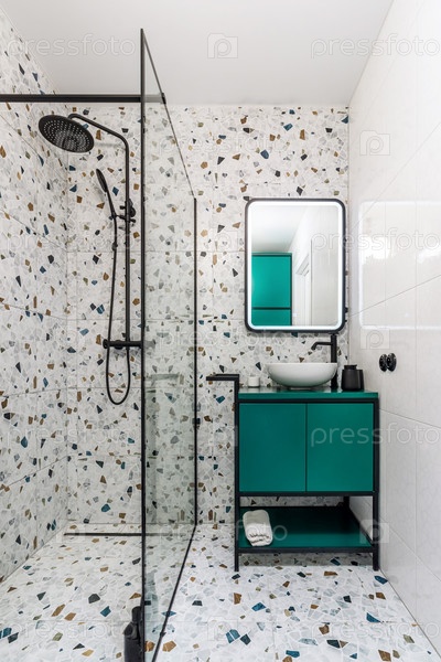 Ванная комната с бирюзовой мебелью, черными смесителями и душем