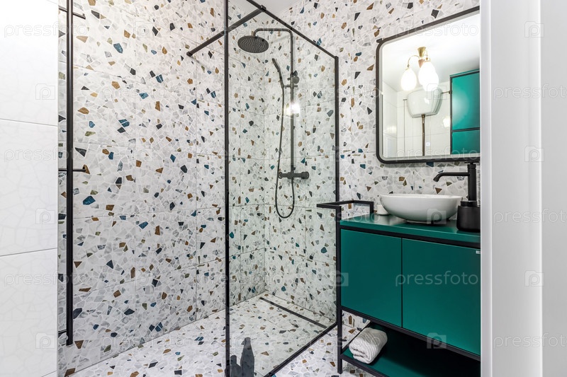 Ванная комната с бирюзовой мебелью, черными смесителями и душем