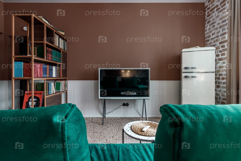 Стильная гостиная в доме с современным ретро-дизайном интерьера, бархатным диваном, растениями, плакатом, макетом карты, книгой, лампой и персональными аксессуарами в домашнем декоре