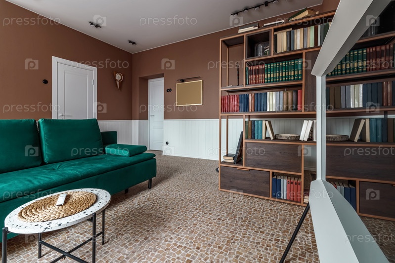 Стильная гостиная в доме с современным ретро-дизайном интерьера, бархатным диваном, растениями, плакатом, макетом карты, книгой, лампой и персональными аксессуарами в домашнем декоре