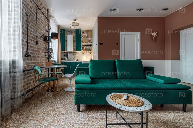 Стильная гостиная в доме с современным ретро-дизайном интерьера, бархатным диваном, растениями, плакатом, макетом карты, книгой, лампой и персональными аксессуарами в домашнем декоре