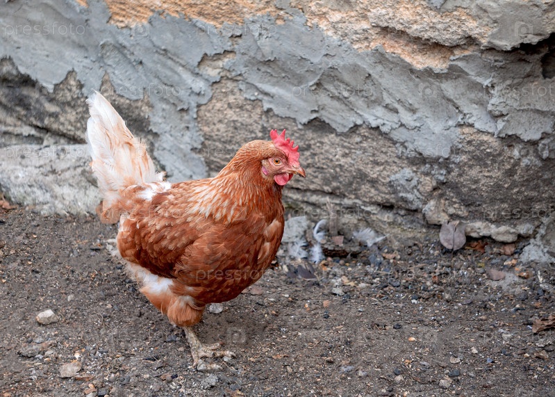 Молодой цыпленок с коричневыми перьями ходит по земле возле бетонного забора