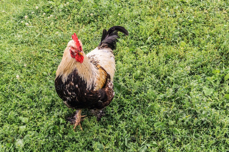 Петух гуляет по зеленой траве. Птица была сфотографирована крупным планом
