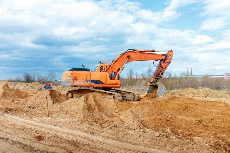 Экскаватор копает траншеи на строительной площадке. Траншея для укладки наружных канализационных труб. Канализационная система многоэтажного дома. Рытье котлованного фундамента
