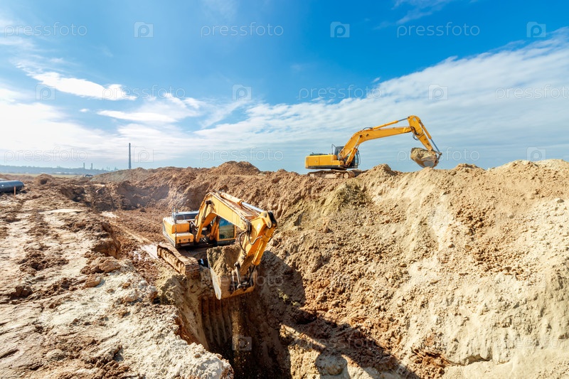 Два экскаватора копают почву на строительной площадке на фоне неба с белым пушистым облаком