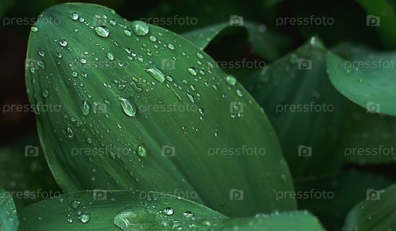 Зеленые листья ландыша с каплями воды