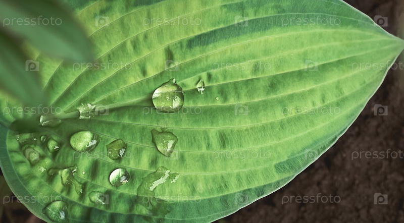 Большой зеленый лист с каплями воды