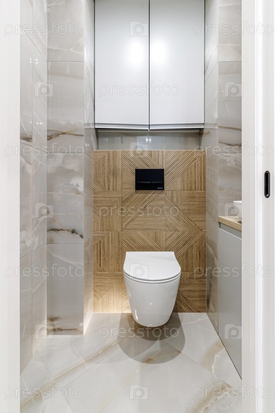 Современный настенный белый унитаз, черная кнопка на фоне бежевой стены ванной комнаты. Часть интерьера ванной комнаты в квартире