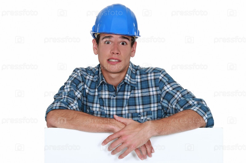 Встревоженный строитель стоит с пустым баннером
