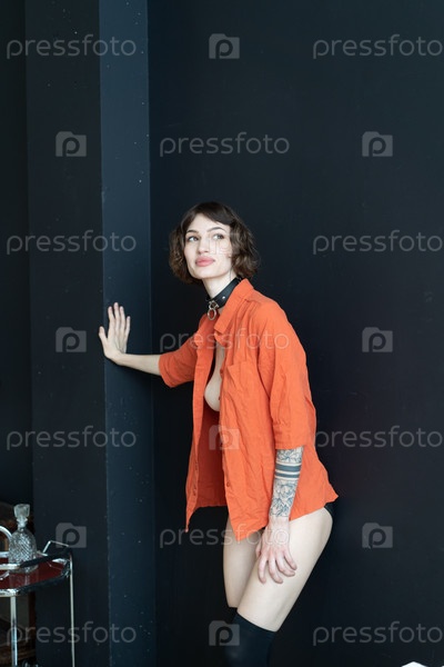 Молодая красивая женщина позирует в оранжевой рубашке в студии