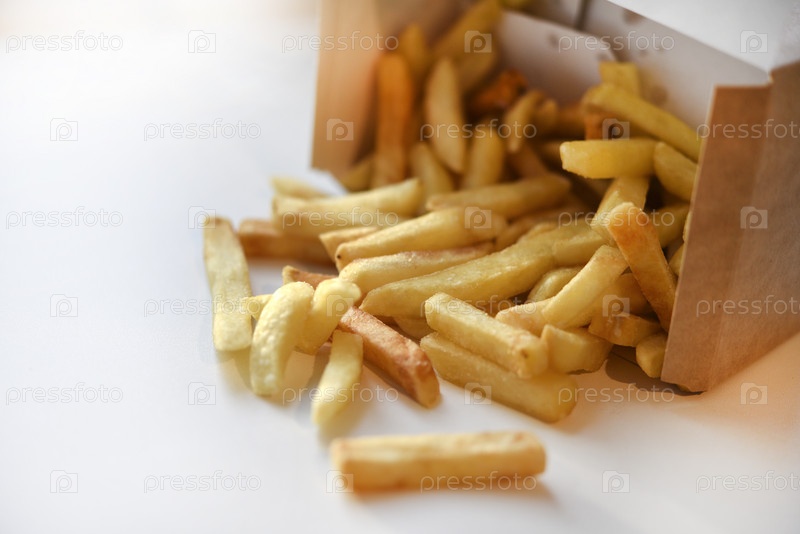 Картофель фри в картонной коробке. Быстрое питание. Жареная картошка. Вкусная закуска