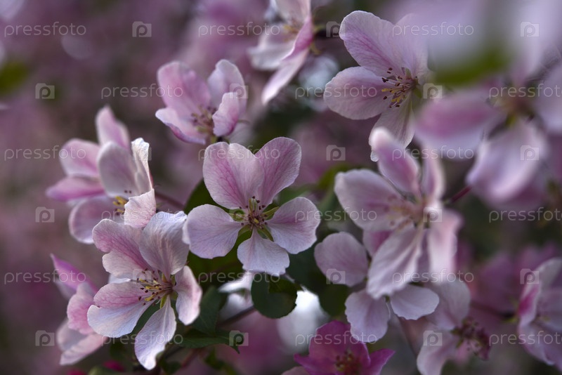 Весной цветет темно-розовая яблоня. Красивое красное яблоко и цветы боке. Крупные цветы