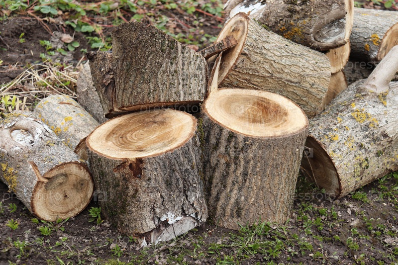 Куча круглых бревен и пней от распиленного орехового дерева