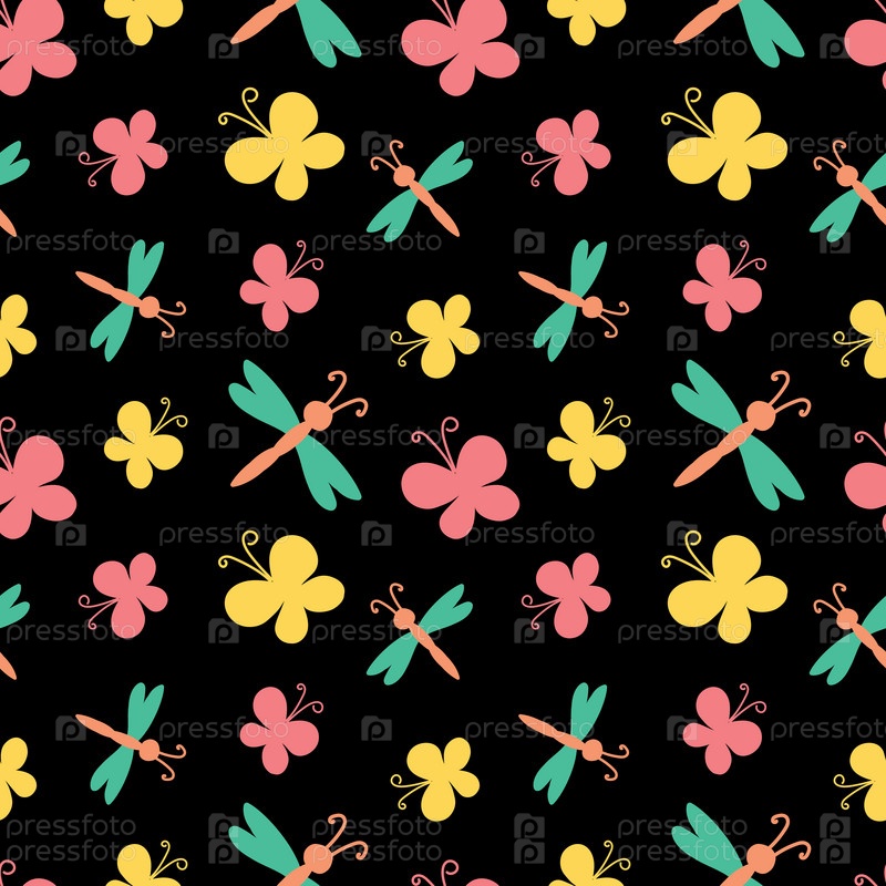 Узор из цветных бабочек и стрекоз на черном
