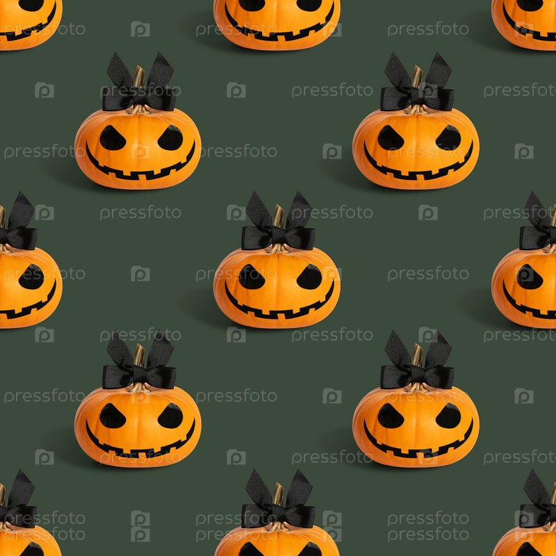 Хэллоуин леди тыквы бесшовные модели на зеленом фоне. Джек фонарь девушка фон. Дизайн для упаковки. Забавная тыква на Хэллоуин