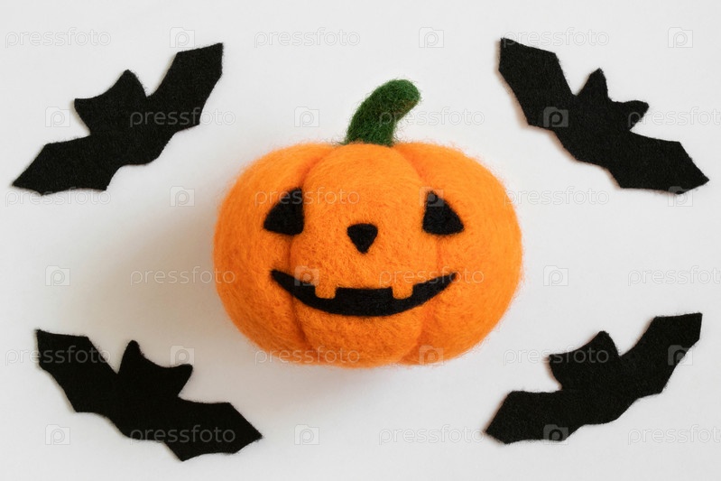 Тыква шерсти Хэллоуина и летучие мыши на белом фоне. Валяная игрушка тыква. Валяние. Вид сверху