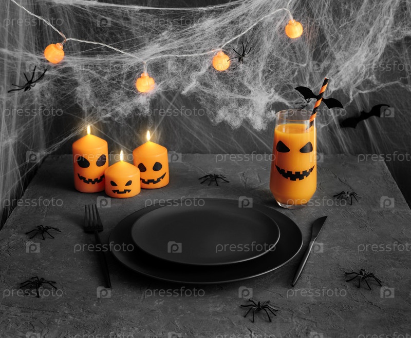 Сервировка стола на Хэллоуин с черными столовыми приборами. Праздничная подача с горящими свечами и гирляндой, тыквенным соком, пауками на темно-сером фоне. Пустая тарелка