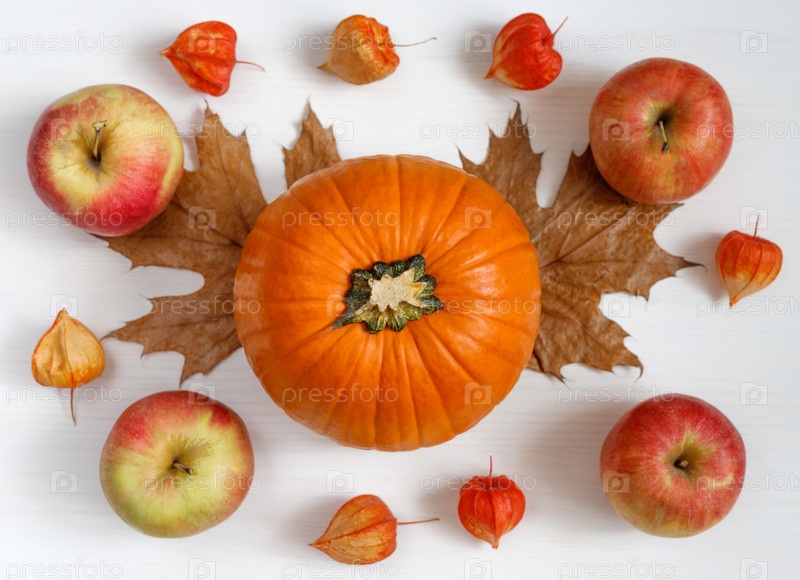 Осенняя композиция. Тыква, сухие листья, яблоки и физалис на белом деревянном фоне. Осенний фон дня благодарения