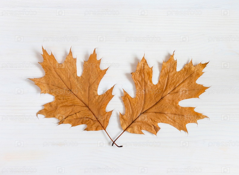 Осенняя композиция. Два сухих кленовых листа на белом фоне деревянные. Осенний фон дня благодарения. Падение концепции