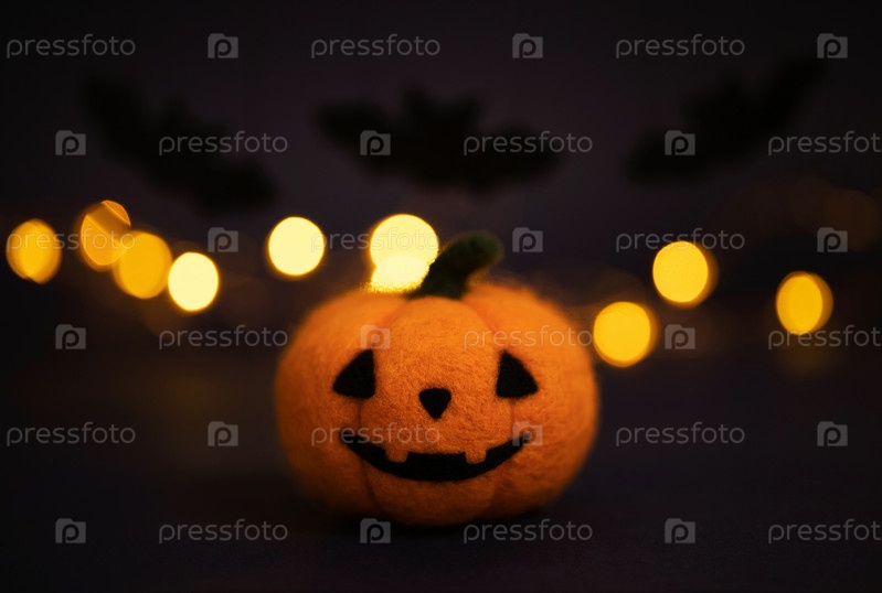 Хэллоуинская тыква. Голова фонаря Джека на темном фоне с боке. Валяная тыква из шерсти