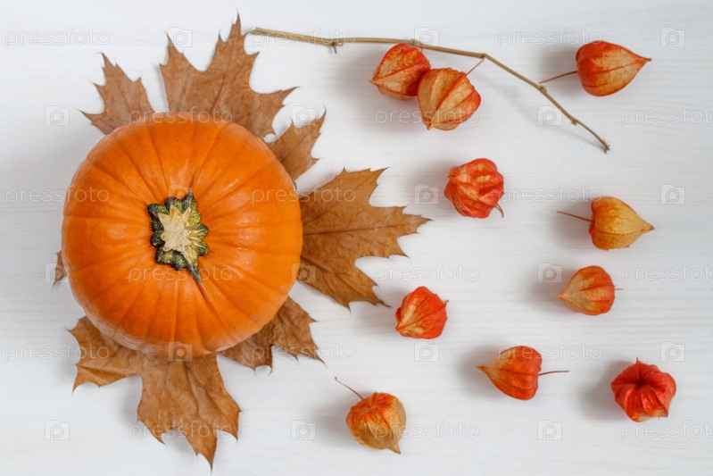 Осенняя композиция. Тыква, сухие листья, яблоки и физалис на белом деревянном фоне. Осенний фон дня благодарения