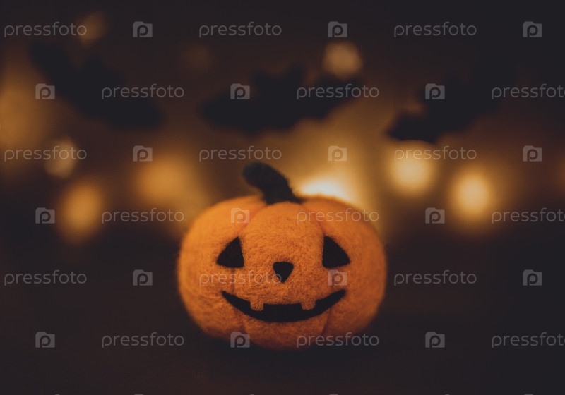 Шерстяная войлочная тыква хэллоуина на темном фоне. Голова фонаря Джека с боке