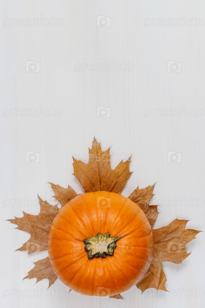 Осенняя композиция. Тыква, сухие листья на белом фоне деревянные. Осенний фон дня благодарения