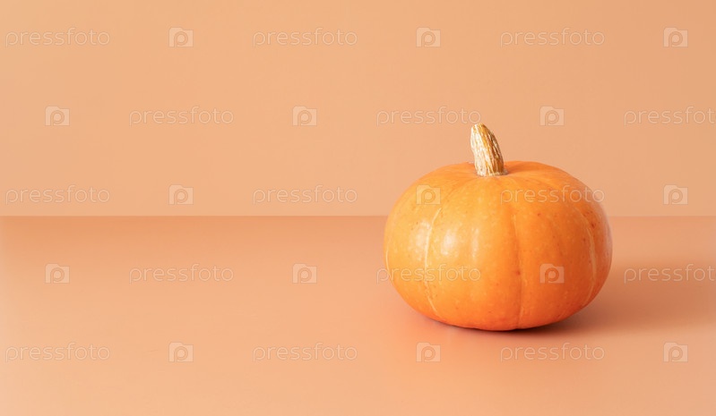Тыква на бежевом фоне. Баннер. День благодарения или осенняя минимальная концепция. Осенний урожай. Скопируйте пространство
