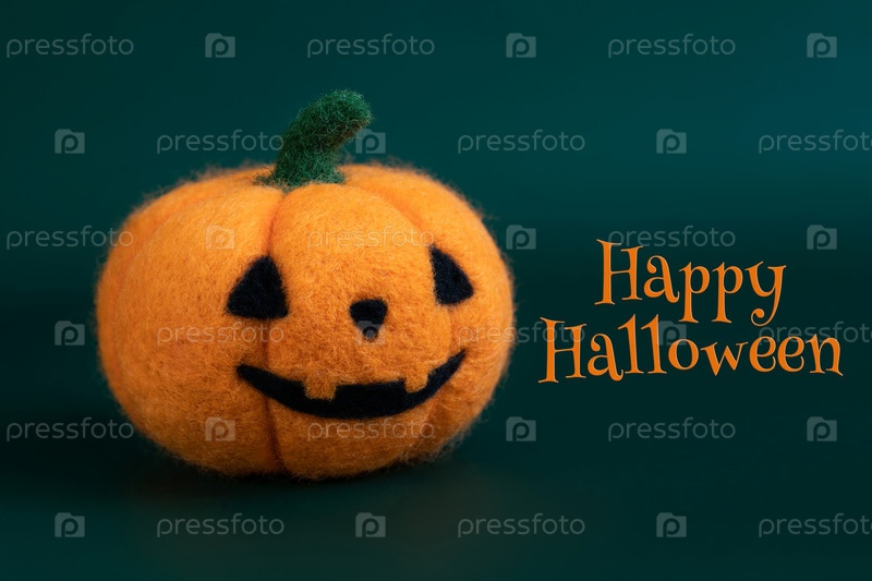 Поздравительная карточка с тыквой для Хэллоуина на тёмно-зеленом фоне со словом Happy Halloween