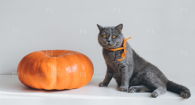 Тыква и кошка на белом фоне. Милый британский кот с большой спелой тыквой. День благодарения, осенняя концепция
