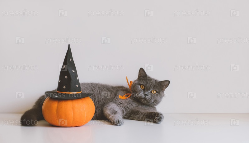 Тыква Хэллоуина в черной шляпе ведьмы и британский кот на белом фоне. Забавный хэллоуинский кот. Скопируйте пространство