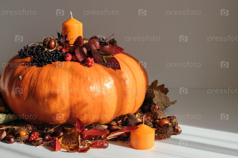 Осеннее украшение тыквой, свечами и сухими листьями крупным планом. Концепция осени или благодарения. Осенний декор