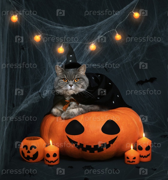 Хэллоуинская кошка в костюме ведьмы на темном фоне. Шотландский кот лежит на большой тыкве с лицом тыквы