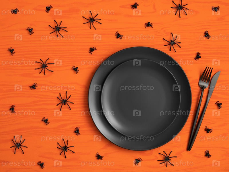 Сервировка стола на Хэллоуин с черными столовыми приборами и пауками на оранжевом деревянном фоне. Сервировка с пустой черной тарелкой для дизайна. Скопируйте пространство, вид сверху, плоская планировка