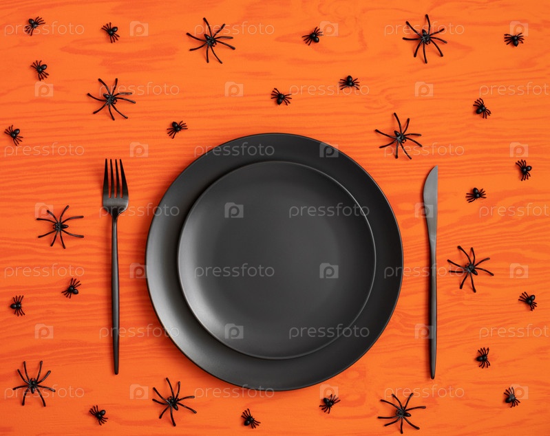 Сервировка стола на Хэллоуин. Пустая черная тарелка и столовые приборы, пауки на оранжевом фоне. Макет или шаблон. Скопируйте пространство, вид сверху, плоская планировка