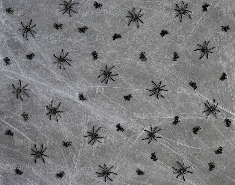 Хэллоуин фон с пауками в сети. Белая паутина с черными декоративными пауками на сером фоне. Концепция счастливого Хэллоуина. Вид сверху, плоская планировка