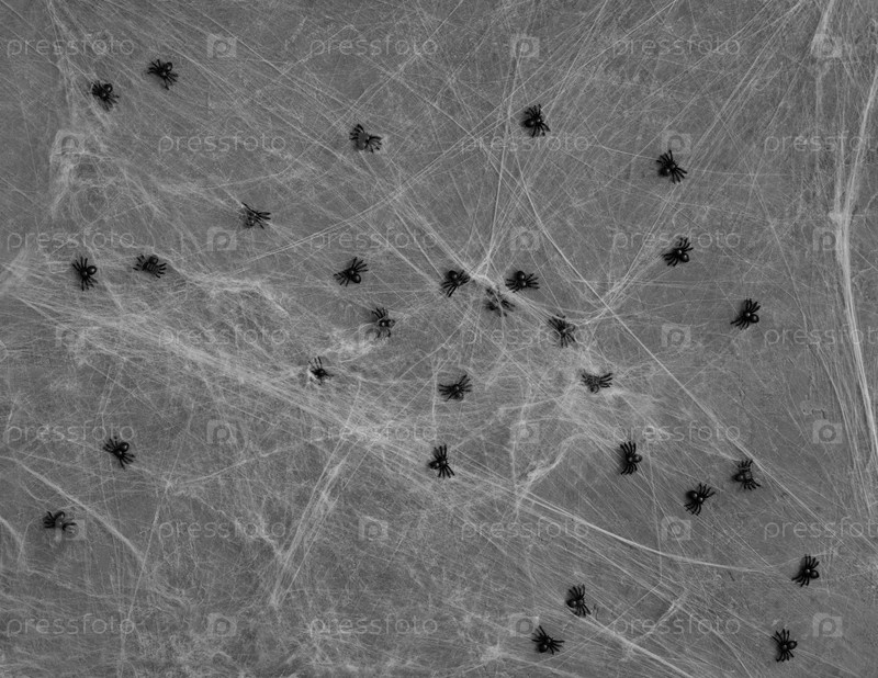 Черные игрушечные пауки в паутине на сером фоне. Хэллоуин фон. Белая паутина с пауками. Вид сверху, плоская планировка