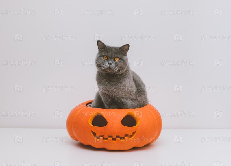 Кошка сидит в тыкве Хэллоуина на белом фоне. Забавный хэллоуинский кот. Скопируйте пространство