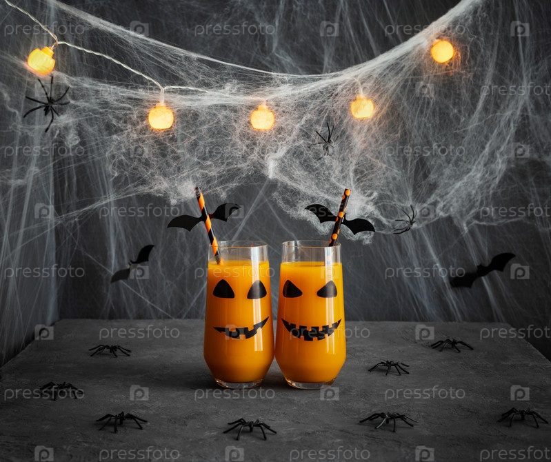 Тыквенный или морковный напиток на Хэллоуин в очках с лицом тыквы. Украшения для вечеринки в честь Хэллоуина с соком, светящимися гирляндами и паутиной на темно-сером фоне
