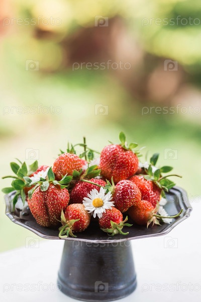 Фрукты и ягоды. Летнее время. Вкусная свежая клубника на стильном ретро железном подносе на белом столе. Место для текста