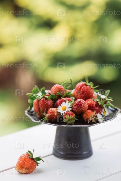 Фрукты и ягоды. Летнее время. Вкусная свежая клубника на стильном ретро железном подносе на белом столе. Место для текста