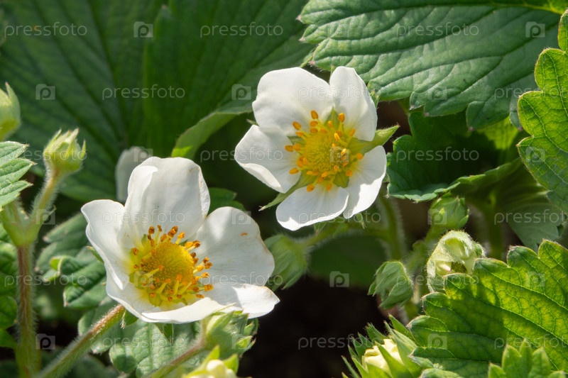 Цветение садовой клубники макрофото. Крупный план маленьких белых цветов кустовой клубники в зеленой листве
