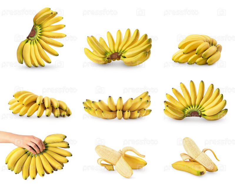Набор различных углов обзора тропических мини-банановых фруктов, изолированных на белом с мягкой тенью. Элемент дизайна для этикетки продукта, печать каталога