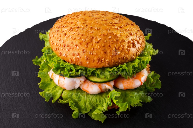 Бургер с кунжутной булочкой, креветками, свежим зеленым салатом и огурцами