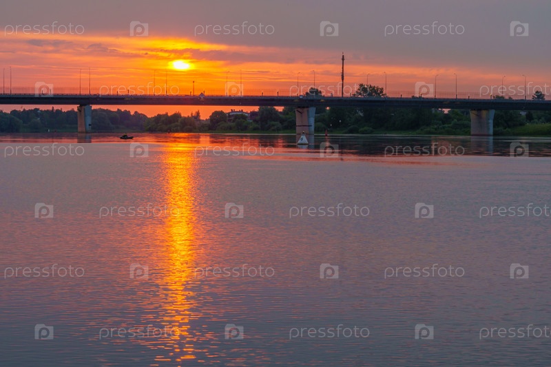 Красивый летний восход солнца над рекой. Мост на фоне восхода солнца летним утром