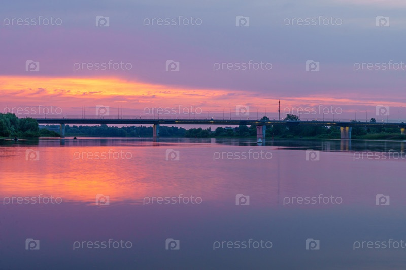 Красивый летний рассвет над рекой. Мост на фоне восхода солнца летним утром